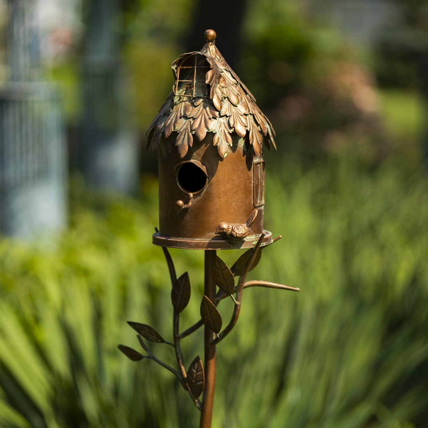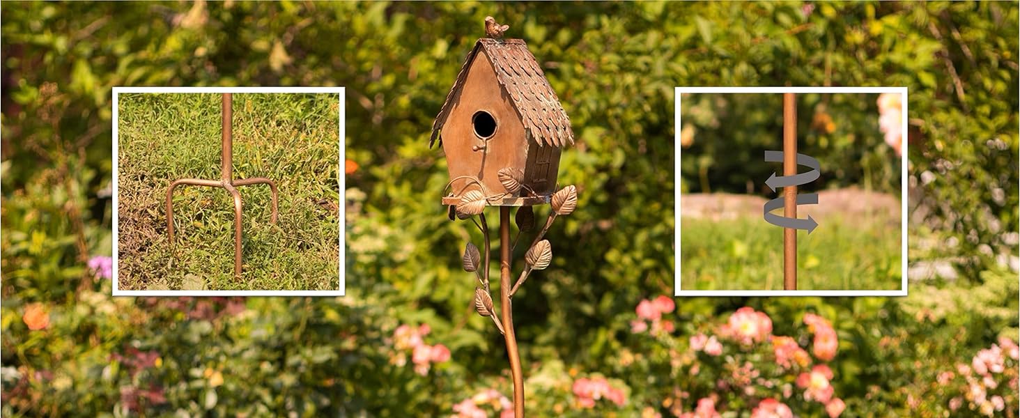 Elevate your outdoor space with these beautifully crafted copper colored birdhouses. Each piece showcases a painted antique copper color finish, excellent quality, and meticulous attention to detail. From the ornate roof designs to the elegant branch and leaf accents on the pole, these birdhouses exude sophistication and charm. Designed for stability, they come with a three-prong stake that simply just twists together with the top half, for secure placement in your garden.